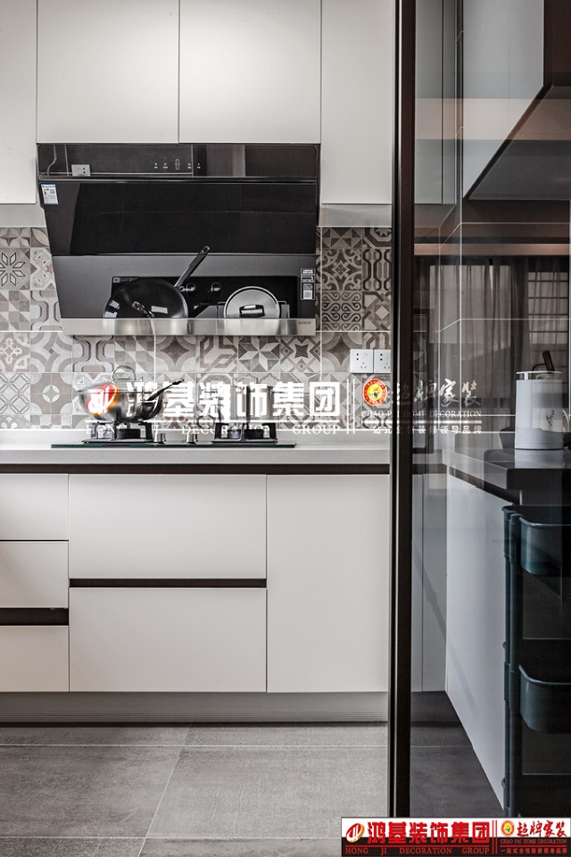 圖8.亮點(diǎn):廚房采用當(dāng)下流行的極窄推拉門(mén)透明玻璃的設(shè)計(jì),墻面采用花磚設(shè)計(jì),拒絕平庸,使整個(gè)空間充滿時(shí)尚感。